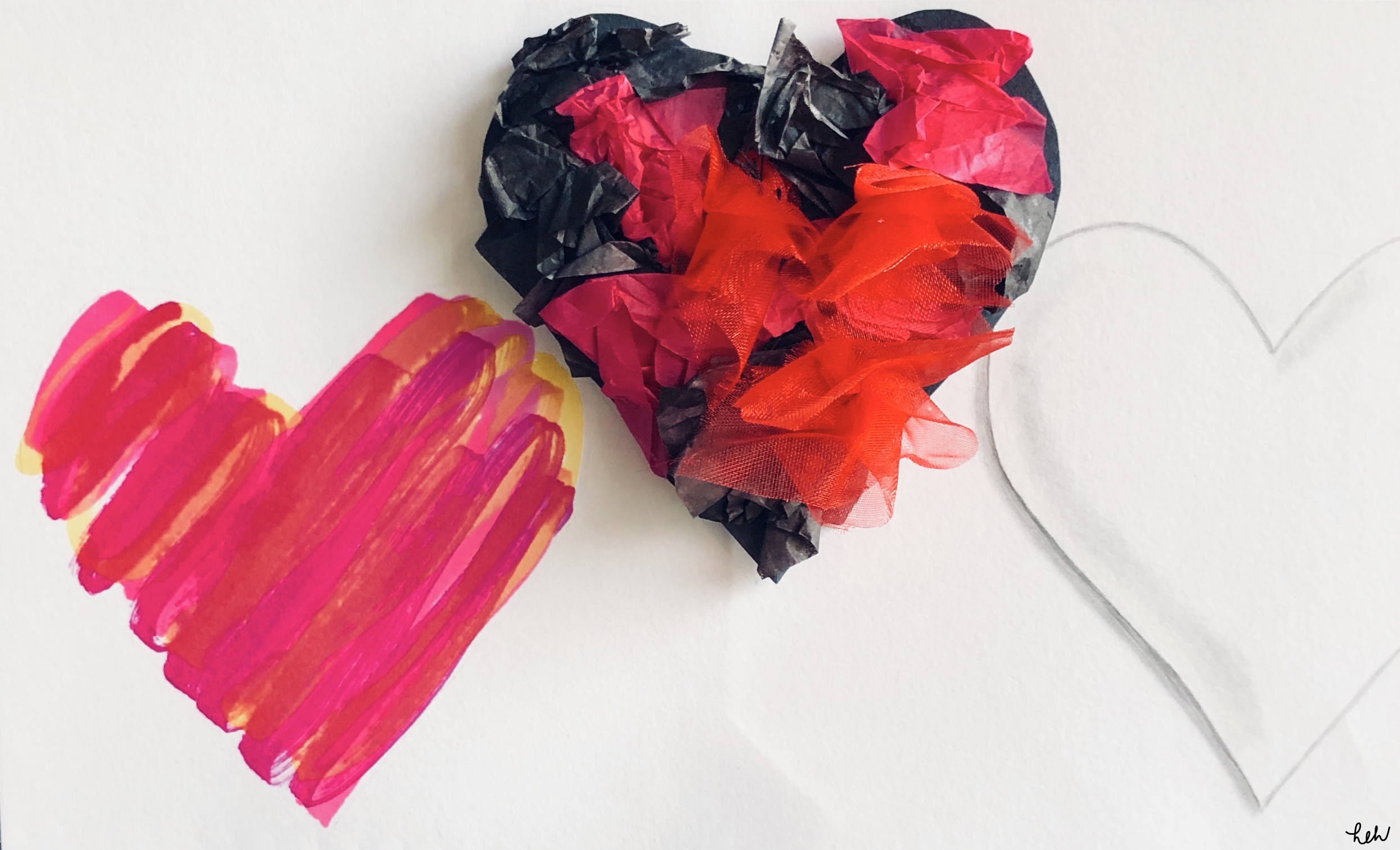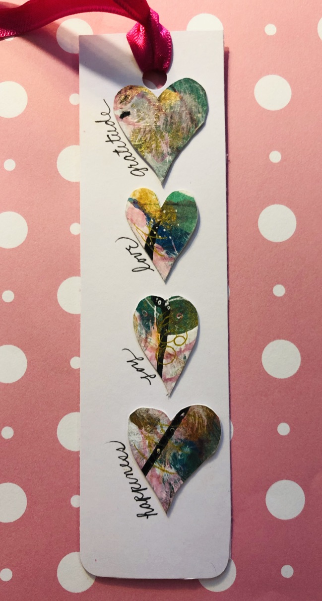 Because I enjoy experimenting with different media and the challenge to reuse things, I took a lot of my discarded watercolor (okay, call them mistakes or flawed) and painted over the paper with acrylics before cutting them into heart shapes. These made nice bookmarks.